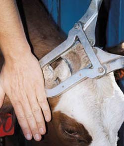 Cow being dehorned using a cup dehorner. Source: NSW Government