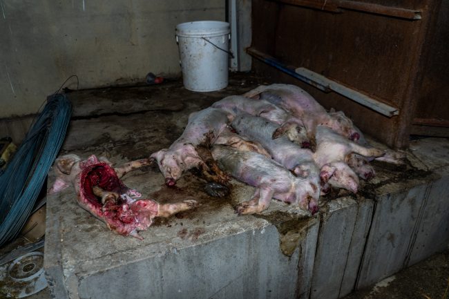 Pigs are seen living alongside and cannibalising the decomposing bodies of dead pigs, who have been left to rot inside the piggery's sheds.