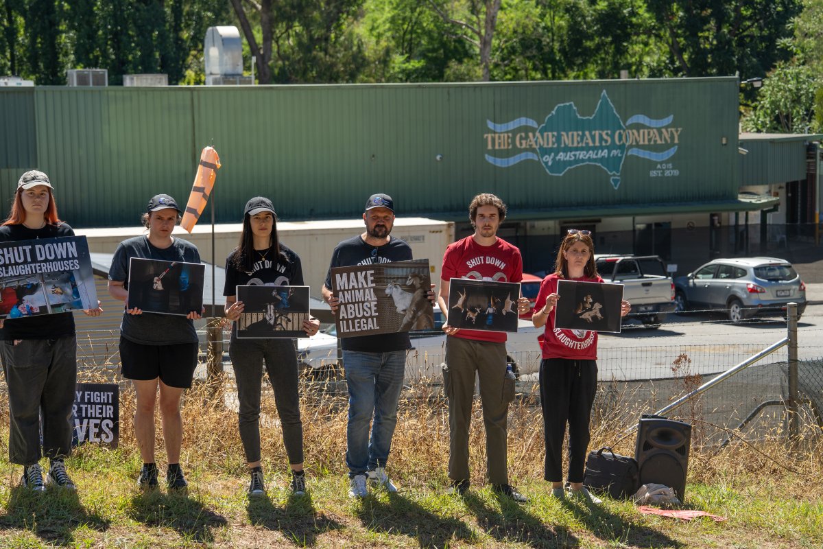 - Protestors from animal protection organisation Farm Transparency Project today gathered outside the Game Meats Company slaughterhouse in Eurobin, Victoria.