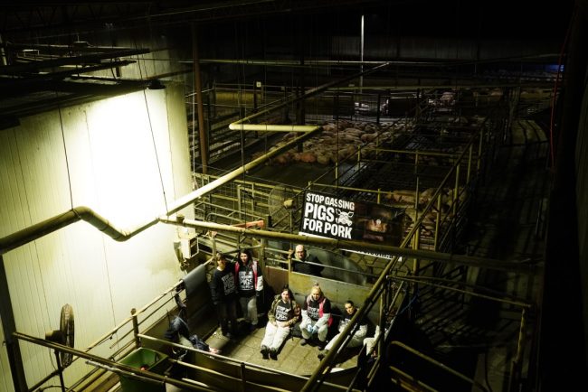 30 protestors have stopped operations at Benalla slaughterhouse in Northern Victoria, chaining themselves onto the gas chamber used to paralyse pigs for slaughter.